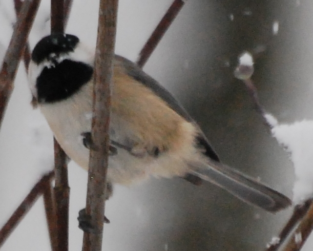 Snow deadens sound, allowing me to stand nearby taking pictures until my feet get cold. I see ten, twenty, maybe as many as thirty birds at once perching on the branches, pecking beneath the feeders, or swooping down to grab some seed or suet.